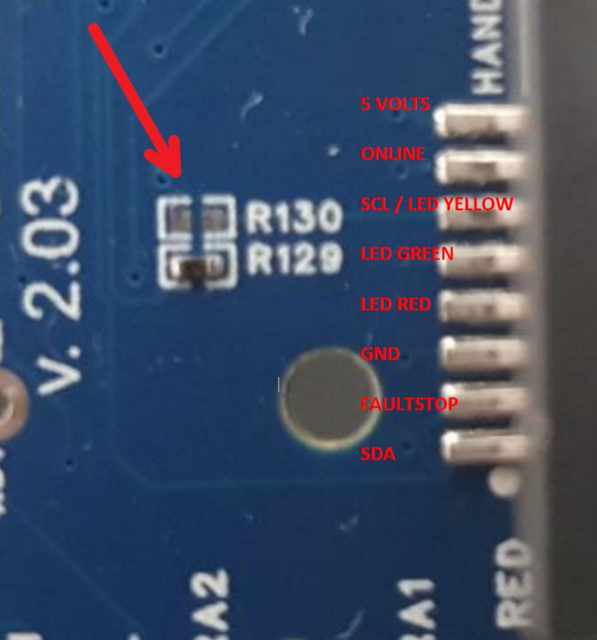 If you want to use a Thanos button box, for example, this is easily possible. Just connect it. The LEDs will not shine as brightly, as we only operate the LEDs with 3.3 volts. But switches and buttons will work. If you also want to operate the yellow LED, you need to move resistor R129 to resistor R130. Please note that if you need to use a Thanos button box, it is absolutely necessary to remove resistor R129 so that the I2C bus is no longer connected to the LED, with the yellow LED logically then connected to ground. This would lead to a collapse of the I2C bus and the controller will not work properly!