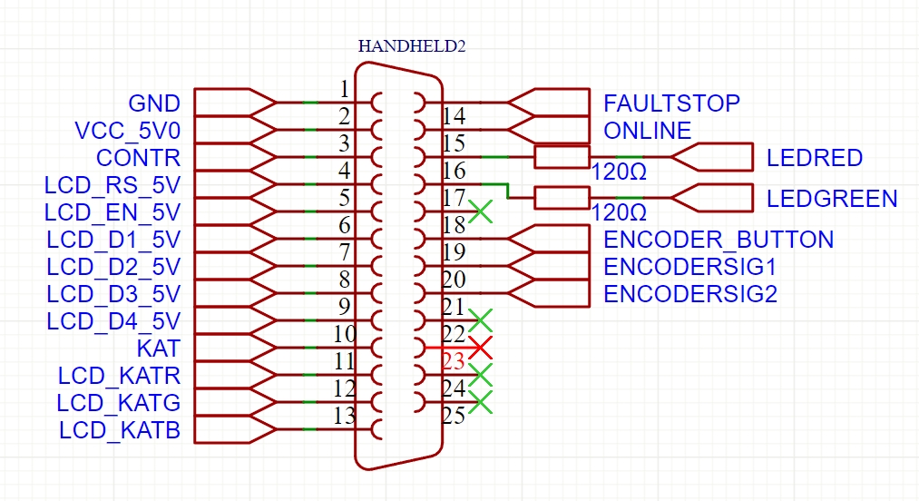 The signals from Faultstop Online, EncoderButton, EncoderSig1, and EncoderSig2 are directly connected to the MCU and are pulled up to 3.3 volts. To generate a signal there, these pins simply need to be shorted to ground. The red and green LEDs are directly connected to the MCU and connected to the Handheld 2 connector via a 120-ohm resistor, allowing the respective 3V3 LEDs to be operated directly. The other pins are suitable for interfacing with an 5V LCD display 16x2, which is operated in 4-bit mode. The connection of an RGB LCD 1602 is also possible.