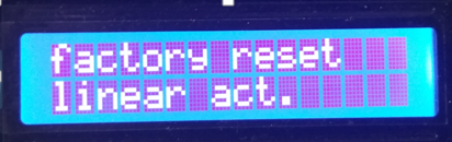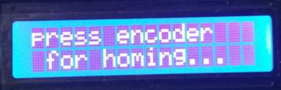 The actuators should now searching for home position. They are searching for a hard stop or running for home switch to trigger. Check that all actuators are turning to the correct direction. If something goes wrong hit the emergency button for stop. Change the settings and repeat. Homing is essential for the controller to work properly. The display shows : X: for unconnected motors H: for started homing sequence(mostly not visible) P: for homing motors (preparing) !: found homing referenz ,running to park or safety position R: for Ready