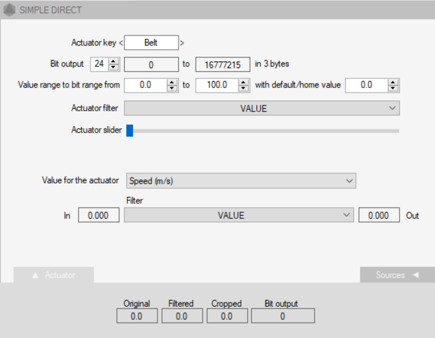 How does it work in practice? It's relatively simple. When you press the online button to activate the rig online, the other actuators move to their standby position and the analog port is activated. After a brief command to set some voltage to tighten it briefly, it is ready to receive the data from the PC via the voltage provided at the belt. The M4S controller supports two modes: the Direct Mode and the Position Mode. In the Direct Mode, the values for the belt are simply scaled to 24 bits at the position of the seventh actor order in the output string. This means 0x000000 for this 3bytes represents no voltage and 0xFFFFFF represents full voltage and full belt tension.